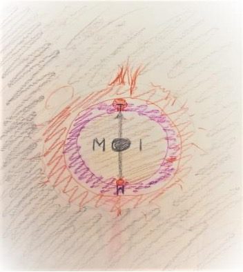 Poi mi spiegò che l’alone rosso che circonda Moi, l’Io, rappresentava per lui l’amore di Laura, da cui cominciava a sentirsi contenuto. L’alone sembra originare da due poli più intensamente colorati di rosso. Sovrapposte a questi poli si leggono le lettere M e T. La scritta Moi è attraversata da una freccia grigia a doppia punta, una rivolta verso il polo M e l’altra verso il polo T.