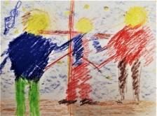 C’è un aspetto che allora non colsi ma che oggi, alla luce della storia clinica, voglio evidenziare. Le tre figure sono tutte trafitte da un’asta che perfora l’addome. Tutte hanno un sole al posto della testa. Forse questa identificazione cosmica leniva un dolore così grande da far impazzire, da distruggere l’apparato stesso per pensare. Forse questo dolore toccava tutta la famiglia ma lui ne porta il peso maggiore. Tornerò su questo punto più avanti.